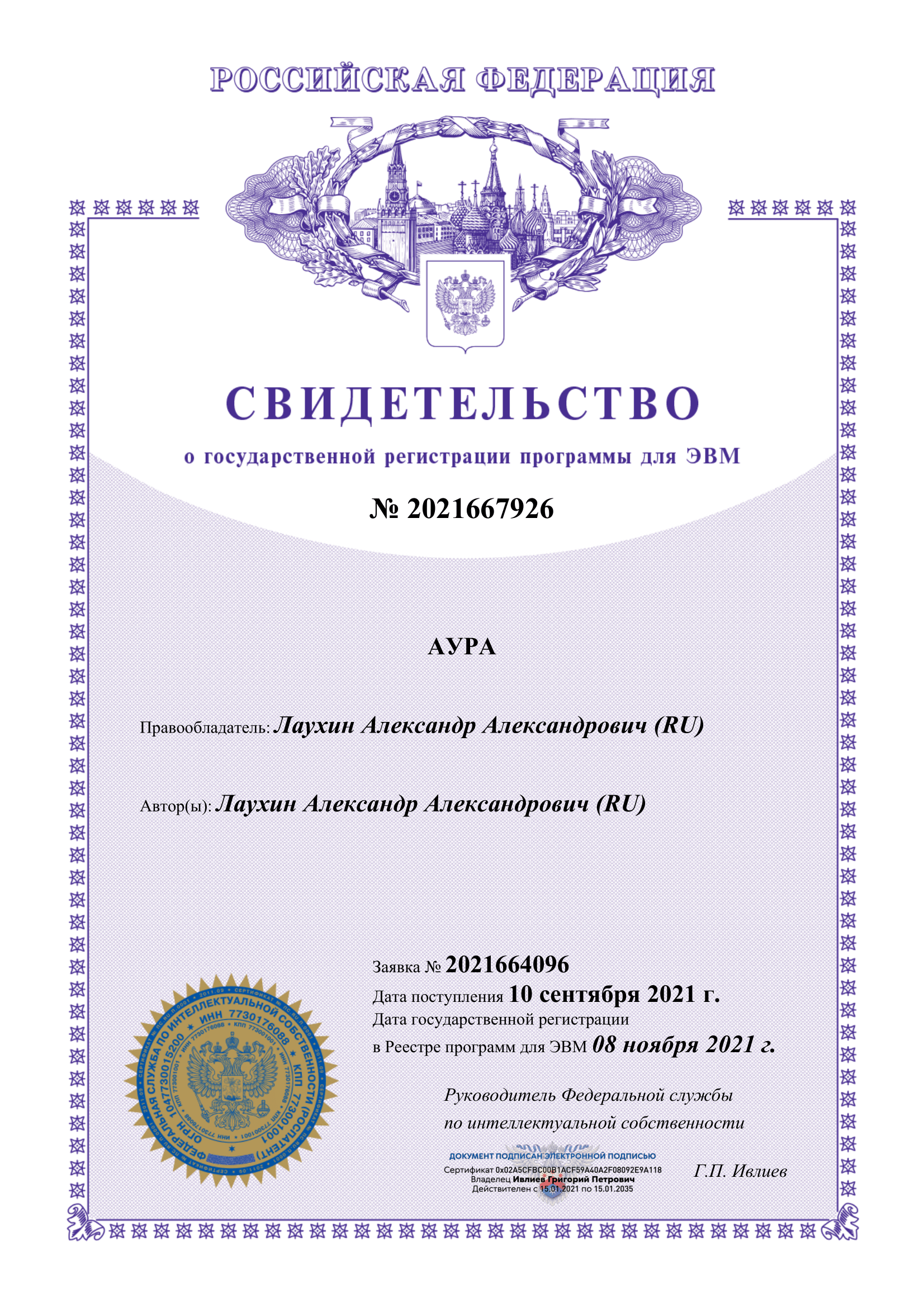 Приложение "АУРА "зарегистрировано в реестре российского отечественного программного обеспечения. Это означает, что ваш продукт соответствует критериям, установленным для отечественных разработок в области ИТ.